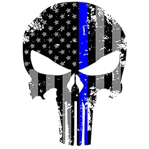 Buy nowK9King Punisher Skull 5.5 x 4 Inch Tattered Subdued Us Flag Reflective Decal with Thin Blue and Red Line (Blue)