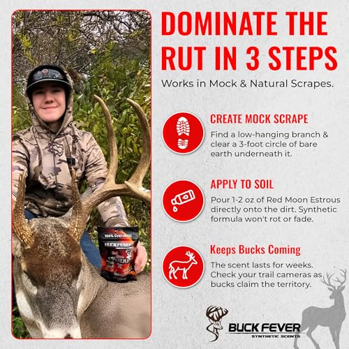 Buck Fever Synthetic Scents Attractant : Lure mature bucks into your hunting area with our premium 2 oz buck scent attractant designed to keep activity high for months. This long-lasting lure never spoils in heat or rain and eliminates harsh ammonia odours that could startle nearby deer. Made from a precisely crafted synthetic blend, this deer lure scent replicates the natural aroma of a mature doe during peak breeding, remaining consistently potent through every season while adhering to CWD legal standards. Unlike real deer urine that degrades quickly, this advanced synthetic buck attractant offers years of reliable storage life and months of ground effectiveness, ensuring safe and consistent use without any biological contamination concerns. Perfect for all-season hunting, our deer bait attracts bucks during both rut and pre-rut phases and works seamlessly with scrapes, mock scrapes, scent drippers, or drag lines. Simply apply the lure to scrapes, wicks, or scent drippers to maintain a naturally active hunting zone. Built for hunters seeking dependable performance and lasting results, this deer hunting equipment is your essential tool for success throughout the peak breeding season. – About Us: Buck Fever is a brand proudly made in the USA. known for its cutting-edge synthetic hunting attractants. The company delivers a full lineup—from deer, elk, and bear scent formulas to scent elimination sprays or decals—all designed to elevate your hunting game.