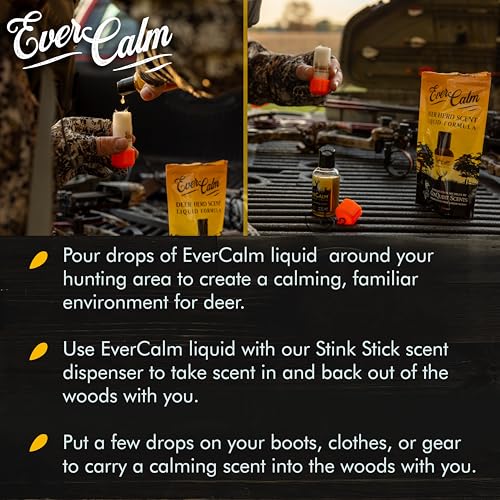 VERSATILE APPLICATION: Simply pour drops of EverCalm Deer Attractant Liquid in your hunting area or use our Stink Stick scent dispenser to take scent into and back out of the woods with you.