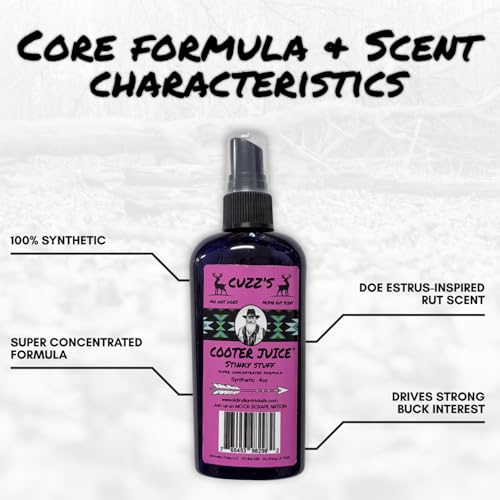 Cuzz’s Cooter Juice — Synthetic Doe-in-Heat Scent for Serious Deer Hunters When the rut heats up, realism wins. Cuzz’s Cooter Juice is a field-proven synthetic doe estrus scent that mimics the natural pheromones bucks seek during pre-rut and peak rut. Designed by hunters who understand deer behavior, this formula delivers consistent, believable scent cues that trigger curiosity and breeding instincts without the risks of biological materials. Each bottle is engineered for performance—long-lasting, weather-resistant, and effective in any setup. Apply to scent wicks, drag lines, or mock scrapes to create natural scent trails and hold buck attention longer. The synthetic blend resists wind and temperature shifts, keeping your setup potent through every hunt. Whether you’re hunting timber, field edges, or over scrapes, Cooter Juice adds the realism and reliability that seasoned hunters trust when it counts most. It’s not just scent—it’s your edge when the competition for dominance begins. Fools bucks like the real thing.