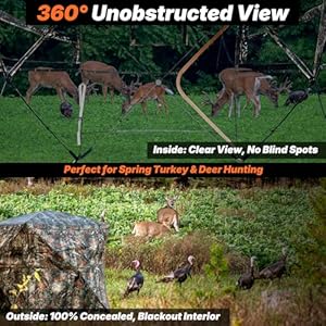 【360° UNOBSTRUCTED SEE-THROUGH VIEW】 Equip yourself with four full panels of one-way see-through mesh. This revolutionary design provides a complete panoramic view, allowing you to track deer and turkey from any angle without blind spots, all while remaining completely invisible from the outside.